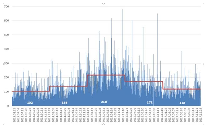 Il grafico qui sotto presenta una volatilità intraday dell'indice CFD misurata dalla variazione media giornaliera dei punti. Le barre blu mostrano un cambio giornaliero dei punti mentre la linea rossa mostra una media dell'anno. Possiamo notare che la volatilità è aumentata di recente, offrendo ancor più opportunità di trading.