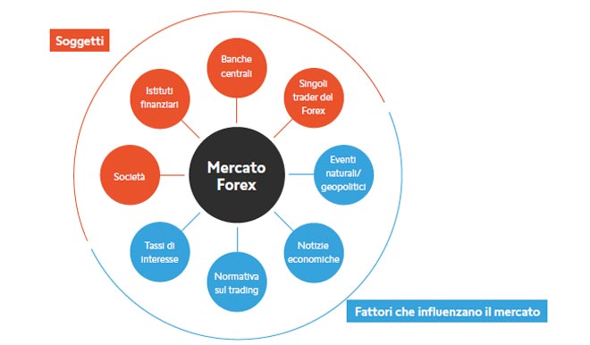 Le persone fanno trading di valute in base alle aspettative sul futuro, formate da diversi fattori. Ogni soggetto del mercato ha i suoi obiettivi. Vi sono le società, che fanno hedging per proteggere le loro attività; vi sono i trader che si basano sull'analisi fondamentale, concentrandosi sui fattori che riguardano l'andamento di intere economie; vi sono i trader che si basano sull'analisi tecnica e seguono i modelli di prezzo per aprire le loro operazioni di trading. Poi, vi sono le banche centrali, gli hedge fund e gli istituti finanziari, tutti a interpretare il trading a modo loro e con particolari obiettivi.