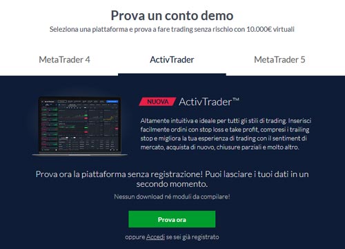 I migliori Broker come ActivTrades offre un conto demo per dare la possibilità di fare trading senza rischi provando le proprie capacità o di sperimentare le proprie strategie.