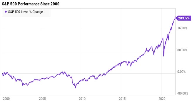 Eppure, nonostante queste significative flessioni, l'S&P 500 è ancora in rialzo di oltre il 200% dal 2000.