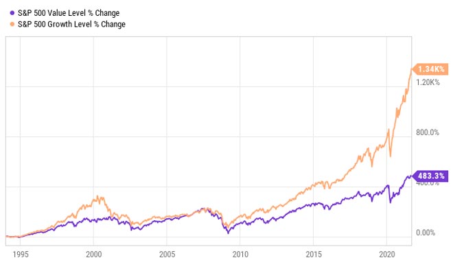 È possibile, tuttavia, che il mercato abbia superato il suo amore resiliente ma tiepido per le azioni value. Dalla metà degli anni '90, i titoli growth hanno sovraperformato in modo piuttosto affidabile i titoli value nonostante la loro maggiore volatilità. Nel complesso, come gruppo, hanno guadagnato quasi tre volte di più rispetto alle azioni value in quel lasso di tempo.