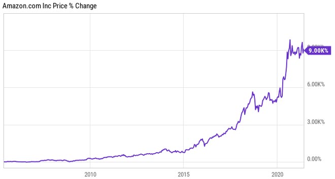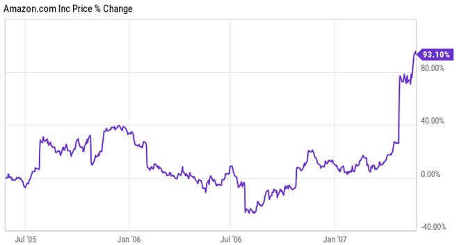 Consideriamo uno degli esempi più ovvi di questo, Amazon. Immaginate gli investitori che hanno investito 1.000 euro alla fine di maggio 2005. È facile immaginare che gli stessi investitori, due anni dopo, abbiano pensato che sarebbe stata una buona idea bloccare i profitti e vendere; dopotutto, un rendimento del 93% non è niente male.