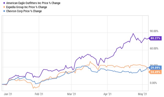 Le aziende in settori in crisi come la vendita al dettaglio, i viaggi e l'energia si stanno riprendendo. Ecco perché azioni come American Eagle Outfitters (AEO), Expedia (EXPE) e Chevron (CVX) hanno tutte recuperato e sovraperformato l'S&P 500 finora quest'anno.