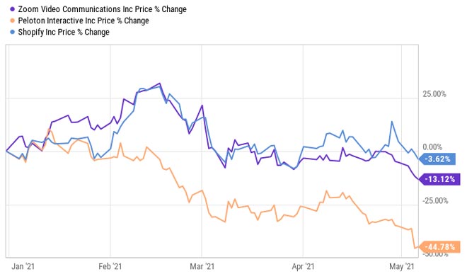Zoom, che è diventato sinonimo di videochiamate durante la pandemia, potrebbe subire una crescita più lenta poiché più persone tornano a scuola e al lavoro. La domanda per le bici da allenamento a distanza di Peloton potrebbe diminuire con la riapertura delle palestre e meno commercianti potrebbero fare affidamento su Shopify mentre riaprono le loro attività fisiche.