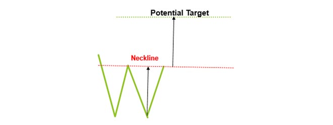L'inverso del precedente pattern grafico è il doppio minimo, che può comparire in fondo a un trend ribassista, dove due picchi verso il basso si creano allo stesso prezzo o a un prezzo molto vicino. Questo è un pattern di inversione rialzista.