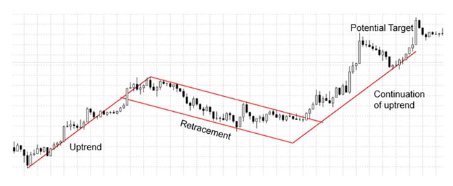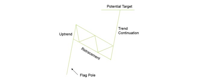 In un flag rialzista, il prezzo si alzerà prima di ritirarsi controtrend. Se disegnate linee parallele sopra e sotto il rintracciamento del prezzo, questo vi darà la forma del flag. L'entrata del prezzo sarà alla rottura della linea superiore del flag, oppure potete aspettare un retest della stessa, che crea un picco più alto. Questo picco rende maggiori le possibilità di un trade di successo. Misurando il trend al rialzo e passando per la sua lunghezza fino alla fine del pattern, otterrete il vostro potenziale target.