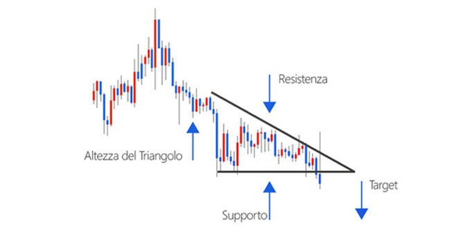 In un triangolo discendente i trader aspettano di andare short quando il prezzo chiude sotto il supporto e prendono come target un livello inferiore ad una distanza equivalente all'altezza del triangolo.
