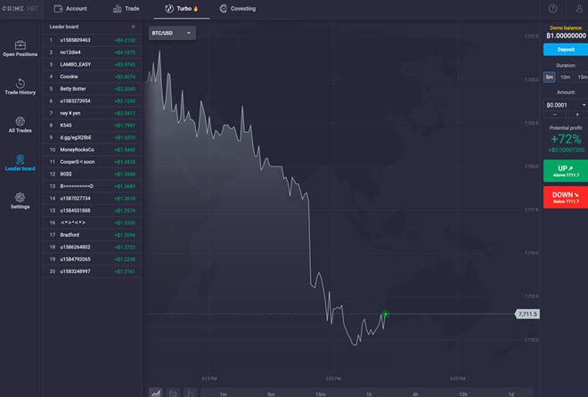PrimeXBT Turbo è una piattaforma per UP e DOWN, contratti di breve durata regolati da Bitcoin composti da intervalli di 30 secondi, un minuto o cinque minuti. I profitti possono raggiungere il 90% in soli 30 secondi, rendendo lo strumento incredibilmente potente ma certamente rischioso.