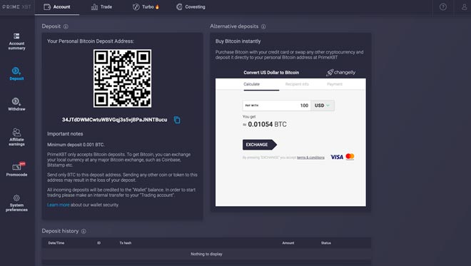 I depositi minimi sono solo 0,001 BTC, effettuati su un portafoglio Bitcoin generato dalla piattaforma. Lo stesso portafoglio può essere utilizzato per i prelievi. Metodi di deposito alternativi sono disponibili tramite un servizio di terze parti implementato nella pagina di deposito della piattaforma. Può essere utilizzato per depositare utilizzando fiat o altre criptovalute.