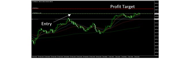 Il grafico sopra mostra una operazione rialzista con un Target impostato. Appena il prezzo raggiungerà il Target, l'ordine verrà chiuso immediatamente determinando un profitto.