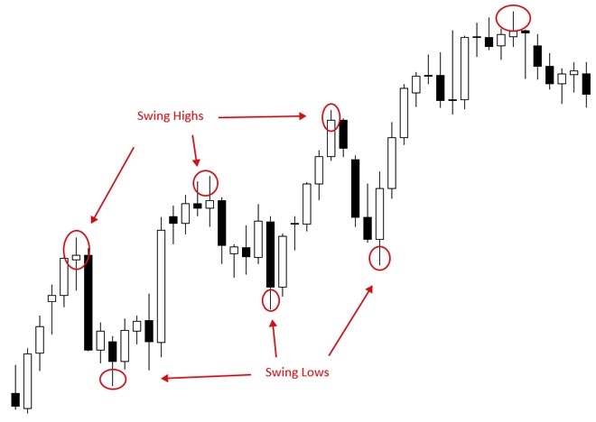 Nello studio dei grafici forex, il trader ha il compito di trovare i livelli più bassi di uno swing (noto come “swing low“) (o possono essere più alti, a seconda se si desidera acquistare o vendere coppie di valute). In altre parole, lo swing trader cerca di trovare i punti più bassi di una tendenza al rialzo o viceversa.