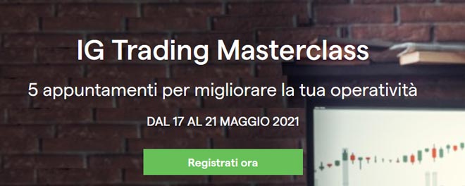 Fare trading comporta dei rischi. I CFD sono strumenti complessi che comportano un rischio di perdita elevato dovuto alla leva. 71% dei trader al dettaglio incorrono in perdite quando fanno trading con IG. Vi preghiamo di verificare le vostre conoscenze in merito al funzionamento dei CFD e la vostra disponibilità ad utilizzare i CFD dato l'elevato rischio di perdita. Le opzioni e i certificati turbo sono strumenti complessi che potrebbero generare rapidamente delle perdite. Il vostro capitale è a rischio. Le perdite dei clienti professionali possono eccedere i loro depositi.