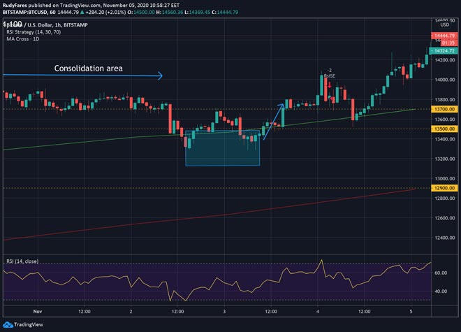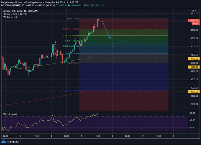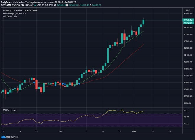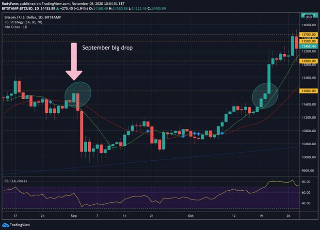 Con l'attuale corsa presidenziale degli Stati Uniti ancora in corso, il Bitcoin ha lasciato il livello di consolidamento per rompere ancora una volta il prezzo di 14.000 dollari e raggiungere persino un massimo di 14.990 dollari. Questo aumento dei prezzi arriva il giorno dopo importante annuncio dell'Ether 2.0 (un contratto che consentirà di inviare ETH da Ethereum a Ethereum 2.0).