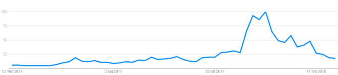 Secondo i dati delle ricerche di Google Trends and Insights, la parola “Bitcoin” sta diminuendo rapidamente. Il grafico risalente a marzo 2017 è quasi identico al grafico dei prezzi settimanali BTC / USD. Lo stesso può dirsi per una varietà di parole popolari che hanno raggiunto i picchi alla fine del 2017 come le parole “Ethereum“, “Ripple” e “Criptovaluta“. I dati di Google suggeriscono che tutte queste parole, incluse le ricerche “Bitcoin”, sono scese di ben oltre l'80%.