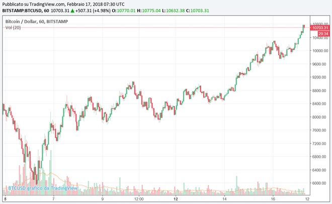Sembrerebbe quindi che il livello psicologico dei 10 mila dollari non sia stato un ostacolo ma il trampolino di lancio, che la criptovaluta numero uno al mondo sta sfruttando per continuare a salire.