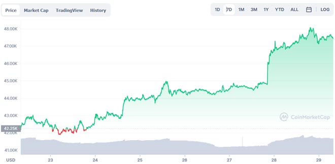 Vale la pena notare che nell'ultimo mese il prezzo di Bitcoin è aumentato del 21,8%, mentre la sua crescita settimanale al momento della pubblicazione era del 16%. Il Bitcoin è aumentato del 35% da quando la Russia ha invaso l'Ucraina mostrando una forza divergente. In particolare, il prezzo è salito da 41.090 dollari sette giorni fa agli attuali 47.492 dollari.