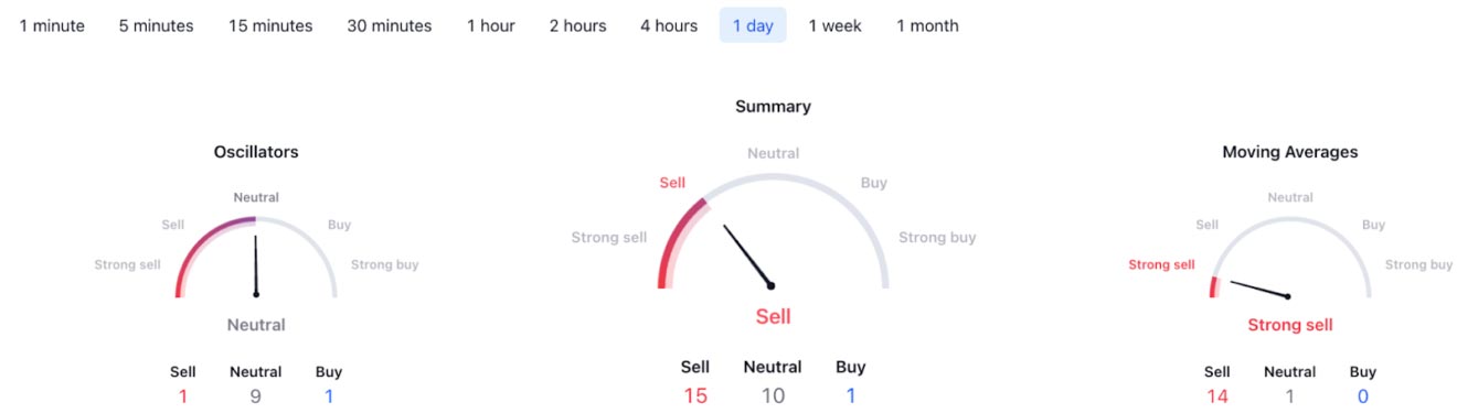 Dal punto di vista dell’analisi tecnica, gli indicatori giornalieri di Bitcoin sono orientati verso il lato ribassista, con un sommario che punta a “vendere” a 10. Le medie mobili suggeriscono una “vendita forte” a 14 mentre gli oscillatori sono “neutrali” a 9.