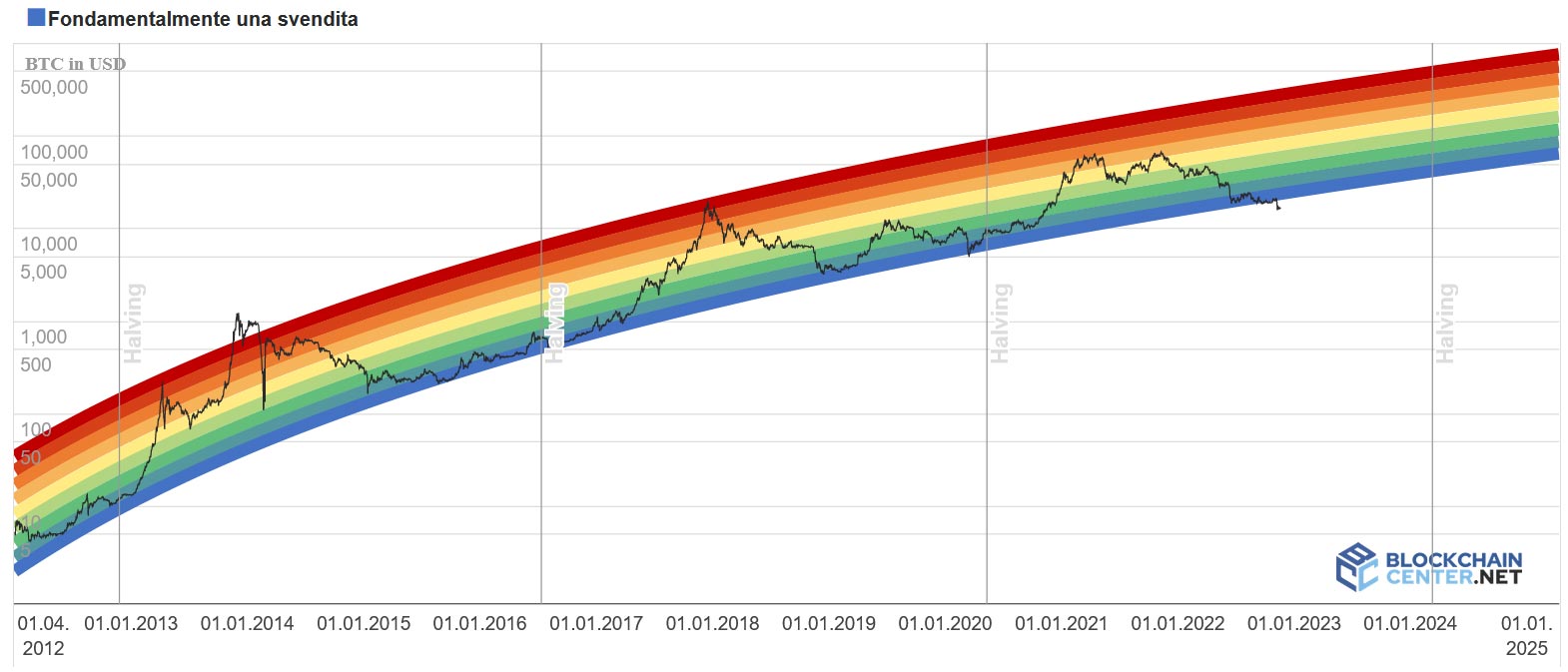Per capire quale sia la direzione futura del BTC, abbiamo preso come riferimento il grafico dei prezzi Rainbow Chart di Bitcoincenter, uno degli indicatori sfruttati dal mercato per determinare la possibile prossima azione di prezzo di Bitcoin. Lo strumento utilizza bande di colore che seguono una regressione logaritmica e rivede le prestazioni passate per fornire una potenziale visione dei suoi movimenti a lungo termine.