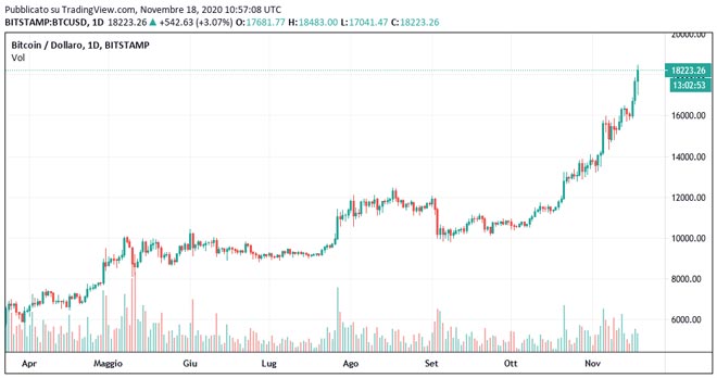 Al momento della scrittura il Bitcoin è scambiato 18.20p dollari con un rialzo del 3%. Se guardiamo indietro, il cambio BTC/USD è stato scambiato l'ultima volta a questo livello durante il rally parabolico del 2017.