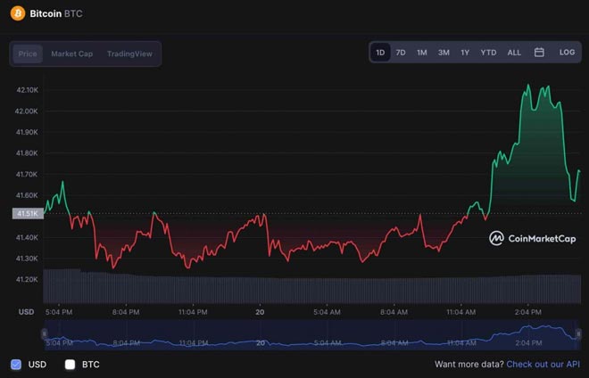 Attualmente, il Bitcoin viene scambiato a 41.923 dollari, in rialzo dell'1.07% e dell'1.75% nell'ultima settimana, secondo i dati di CoinMarketCap.