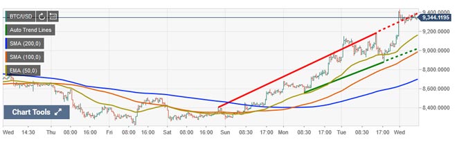 Tecnicamente la mossa sopra i 9.000 dollari ha ravvivato le speranze degli investitori di vedere il Bitcoin di raggiungere il livello psicologico di 10.000 dollari. Tuttavia, per ora, la coppia BTC/USD nel momento in cui scrivano si è riportata sui 9.356 dollari in calo dello 0,57%.