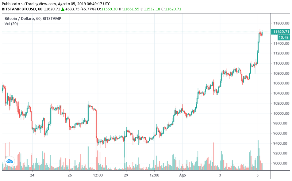 Questa decisa mossa rialzista torna a far sognare gli investitori dopo le ultime settimane di “stallo” in cui i prezzi sono rimasti tra 9.300 agli 10.900 dollari