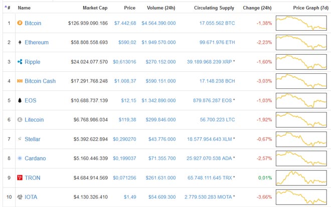 Una fotografica della situazione attuale delle principali valute digitale la si può notare dalla classifica presente sul portale di CoinMarketCap nella quale anche oggi domina il segno meno.
