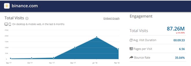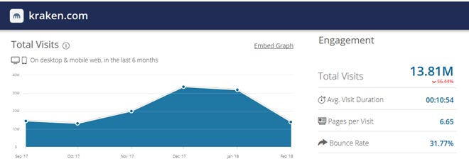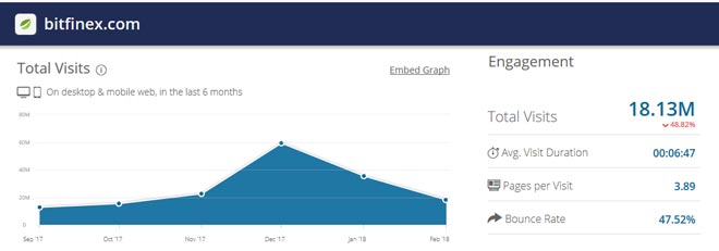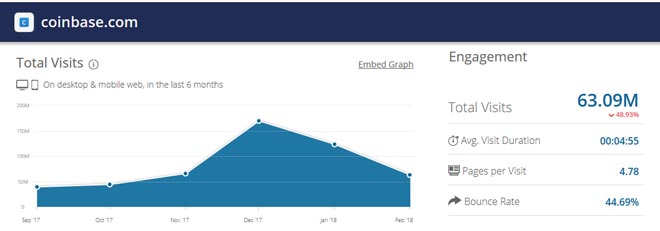 Secondo il portale Similarweb, il numero totale di visite a Coinbase è calato del 49% a febbraio, da 123,5 milioni a 63,1 milioni, dopo aver raggiunto 169,5 milioni a dicembre 2017. Kraken ha visto un calo del 56%, da 31,7 milioni di gennaio a 13,8 milioni a febbraio. Binance ha registrato un calo del 54%, da un picco di 191,5 milioni a 87,3 milioni. Bitfinex è sceso del 48% a febbraio con appena 18,3 milioni di visite, rispetto ai 35,4 milioni di gennaio e 59,3 milioni di dicembre 2017.