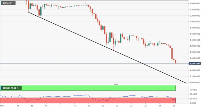 Il cambio BTC/USD prosegue la sua tendenza al ribasso toccando i minimi dell'anno a 3.646 dollari, oltre il 15 percento in meno nelle ultime 24 ore, segno di una crescente volatilità per la cripto. Il Bitcoin nelle ultime ore ha infranto un altro livello chiave e psicologicamente importante a 4.000 dollari, segno che al momento non c'è niente che possa fermare questa discesa dei prezzi.