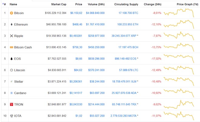 Gli investitori scommettono al ribasso e il mercato gli da ragione; come testimonia la classifica delle prime dieci criptovalute presente sul portale di CoinMarketCap, nelle ultime 24 ore sono tutte in perdita: