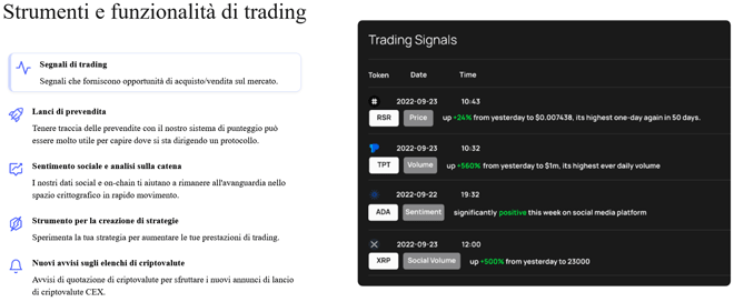 - Monitoraggio del sentimento sociale per indicare le criptovalute di tendenza, nonché analisi sulla catena