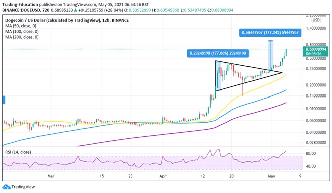 Di solito, la rottura si verifica dalla linea di tendenza ascendente e identifica l'inizio di una tendenza al ribasso. D'altra parte, si verifica un breakout sulla linea di tendenza discendente e indica l'inizio di una tendenza rialzista, simile all'azione dei prezzi in corso di Dogecoin. I modelli simmetrici hanno obiettivi di breakout esatti misurati dal punto più alto a quello più basso. Ad esempio, il breakout di DOGE dal triangolo segna un rialzo del 177% a 0,94 dollari.