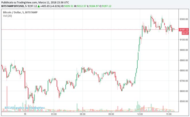 Osservando il grafico delle ultime ore, si nota che il prezzo del Bitcoin in mattinata è sceso fino ai minimi degli ultimi giorni a quota 8.500 dollari, ma nelle ultime ore si è verificato un deciso rimbalzo che ha portato i prezzi sopra quota 9.000 dollari rinnovando speranze da parte degli investitori.
