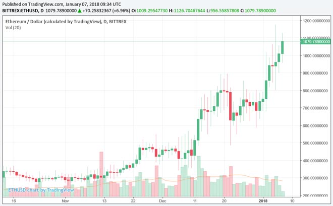 Dopo essere salito sul podio tra le migliori criptovalute del 2017 in termini di performance con un rialzo del 8.140% (dietro solo a Ripple), Ethereum inizia il nuovo anno nel modo migliore registrando nuovi record storici.