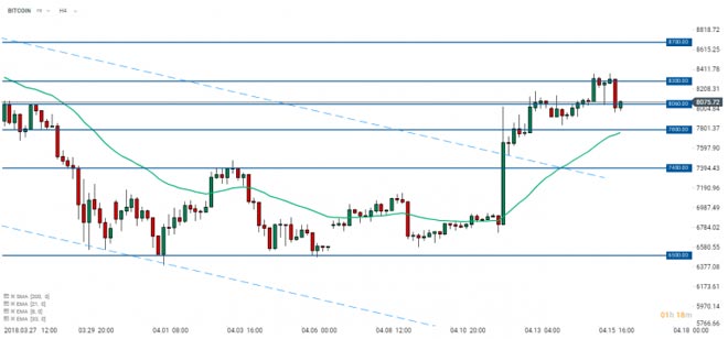 Il prezzo di BITCOIN si è invertito verso il livello di supporto di $ 8060 dopo essere salito a $ 8400 durante il fine settimana. Nel caso in cui la pressione al ribasso prevalga il supporto solido può essere trovato intorno al $ 7800 poiché è sostenuto dalla media mobile a 33 periodi. Fonte: xStation5