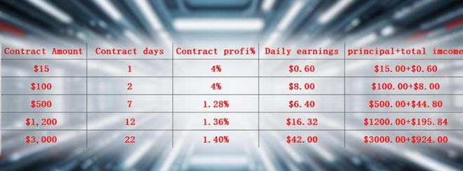 - Scegli un contratto: puoi scegliere tra una varietà di livelli di contratto, a seconda del tuo budget e dei tuoi obiettivi. Inizia a guadagnare: il tuo reddito giornaliero viene accreditato automaticamente sul tuo account ogni 24 ore.