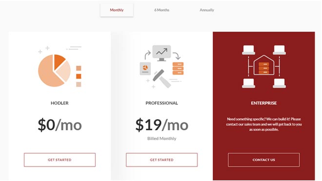 Prezzi: una tassa di abbonamento mensile. Differenza: l'abbonamento gratuito Hodler dà la possibilità di creare un portafoglio e connettersi al proprio account di borsa. Il Pacchetto Professionale include tutte le caratteristiche di Shrimpy tra cui il Costruttore di Indici Personalizzati, il Ribilanciamento, il Backtesting, il Social Trading e gli Insights.