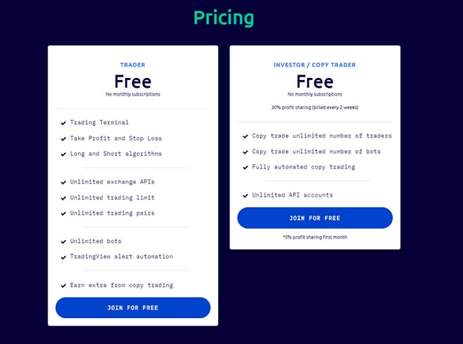 Prezzi: principio di condivisione dei profitti (il primo mese è gratuito, poi dovrai condividere il 30% dei tuoi profitti ogni 2 settimane), nessun pagamento mensile.