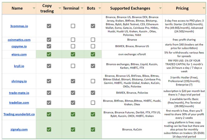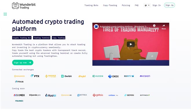 Wunderbit è un'altra piattaforma avanzata di social copy trading concentrata sulle criptovalute che merita una menzione. È un luogo dove gli investitori di criptovalute possono copiare gli ordini di trader professionisti di criptovalute o fare trading da soli creando bot di trading automatizzati. Inoltre, gli utenti possono utilizzare terminali di trading intelligenti. Borse supportate in Wunderbit: Binance, Binance Futures, Deribit, FTX, FTX US, Bybit, Kucoin, OKEX, HitBTC, Kraken.
