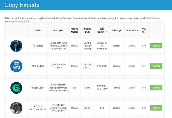Pro: grande scelta di scambi, track record trasparenti dei trader, facilità d'uso, più di 2000+ utenti, la propria borsa Buy Sell, disponibilità di copy trading+terminale+bots; possibilità di utilizzo gratuito durante il primo mese.