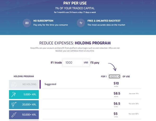Prezzi: 1% del capitale di trading per 1 mese di utilizzo.