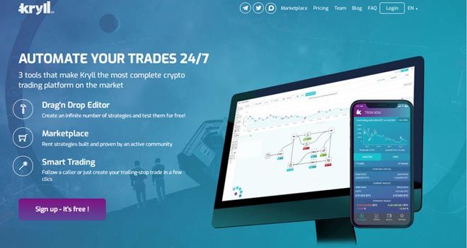 Kryll è una piattaforma di trading automatico di criptovalute, offre dei potenti robot Bitcoin e bot di trading di criptovalute per i trader che vogliono fare trading automatico di criptovalute. Ha un marketplace dove i trader professionisti possono offrire le loro strategie di trading agli altri utenti della piattaforma. È quindi un servizio ideale per un trader principiante o per il pubblico in generale che vorrebbe iniziare il trading di criptovalute senza avere ancora alcuna abilità.