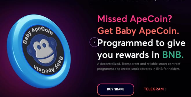Ecco a voi Baby ApeCoin. Si tratta di un token BEP20 sviluppato per offrire agli investitori ricompense in BNB. Sebbene sia considerata da alcuni una moneta commemorativa, Baby ApeCoin è progettata per fornire agli investitori una reale utilità. Offre ricompense statiche in BNB, pagate ogni 60 minuti.
