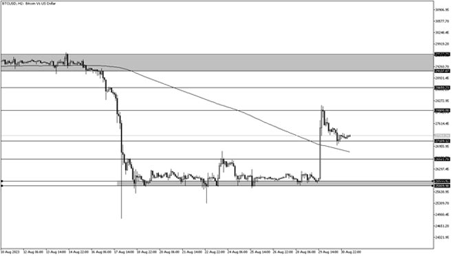 Dal punto di vista tecnico, su un intervallo temporale di 2 ore, Bitcoin ha un supporto situato al livello di $27.109. Se si mantiene sopra questo livello, l’attenzione potrebbe rivolgersi al livello psicologico dei $28.000 come prossimo punto di resistenza, seguito dai livelli $28.650 e $29.137. In alternativa, se non dovesse stabilizzarsi sopra i $27,109, l’interesse degli acquirenti potrebbe spostarsi ai livelli $26.581 e successivamente alla zona di supporto tra $25.944 e $25.809.