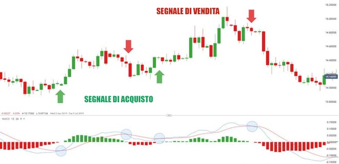Mentre un segnale di acquisto viene generato quando la linea MACD attraversa la linea del segnale, un segnale di vendita viene generato quando la linea MACD attraversa la linea del segnale e può essere utilizzato per identificare la giusta opportunità di vendita.