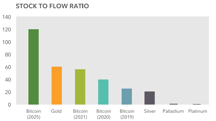 Il Bitcoin non è soggetto a inflazione e svalutazione tanto quanto le valute legali. A causa del modo in cui il BTC viene estratto, è possibile misurare accuratamente il suo stock to flow (un termine di investimento utilizzato per quantificare la scarsità di un asset, con ‘stock' che si riferisce alla fornitura totale in circolazione e ‘flow' che descrive la quantità di nuova fornitura disponibile annualmente).