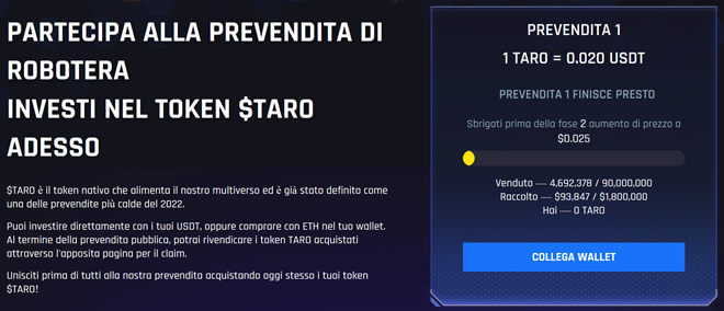 RobotEra è attualmente nella sua prima fase di prevendita ad un prezzo di 0,02 dollari per token. La presale di RobotEra utilizza una struttura dei prezzi scaglionata, il che significa che alla fine di ogni fase di presale del token, vedremo aumentare anche il valore del token TARO.