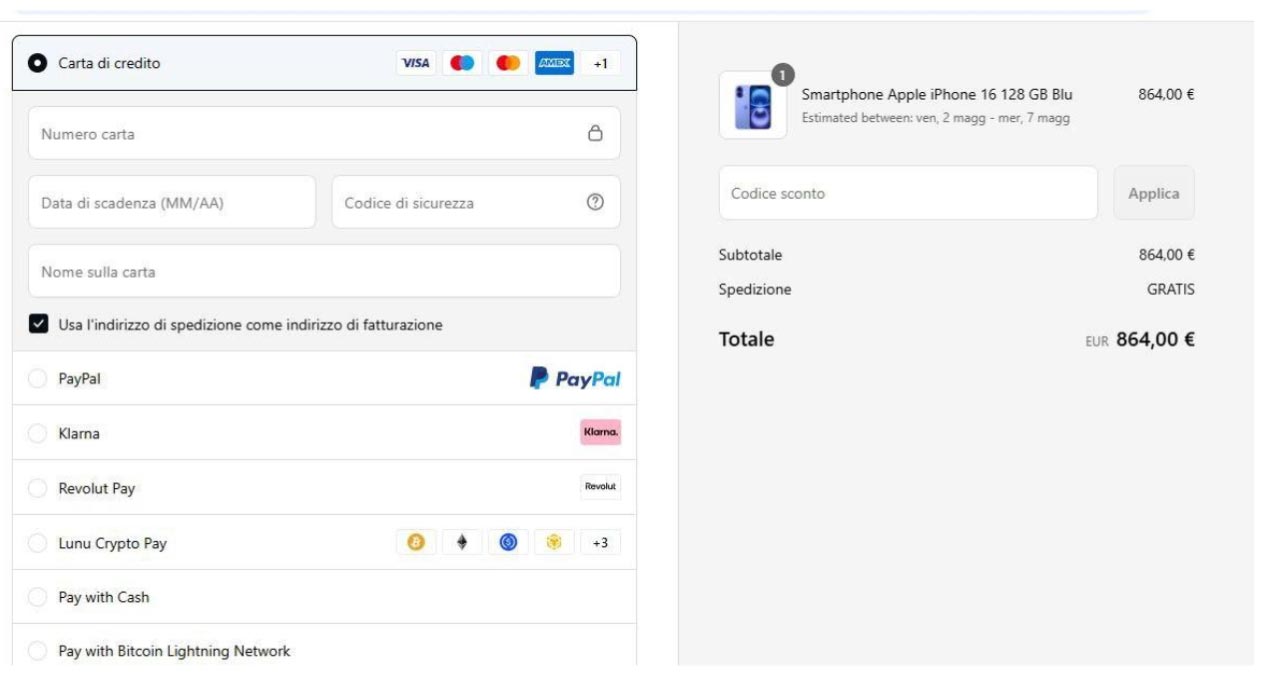 prezzo, permettendo di pagare come vuoi (crypto, contanti o rate).