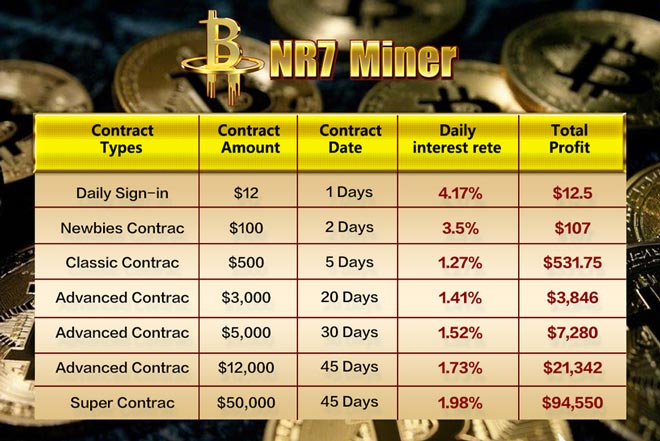 NR7 Miner continua a innovare, ottimizzare l'esperienza dell'utente e creare una piattaforma di cloud mining di alto livello. Visita https://www.nr7miner.com Ora, e goditi un bonus di $ 12 per la registrazione di un nuovo utente!
