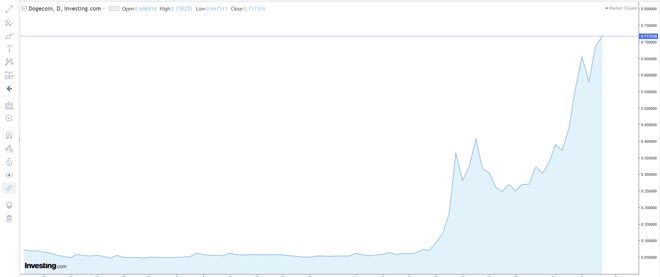 È l'ennesima giornata al rialzo per Dogecoin, la criptovaluta nata come scherzo nel 2013, ha attirato l'attenzione di un grande numero di investitori negli ultimi mesi passando da 0,0034 ai massimi storici a 0,73825 di oggi.